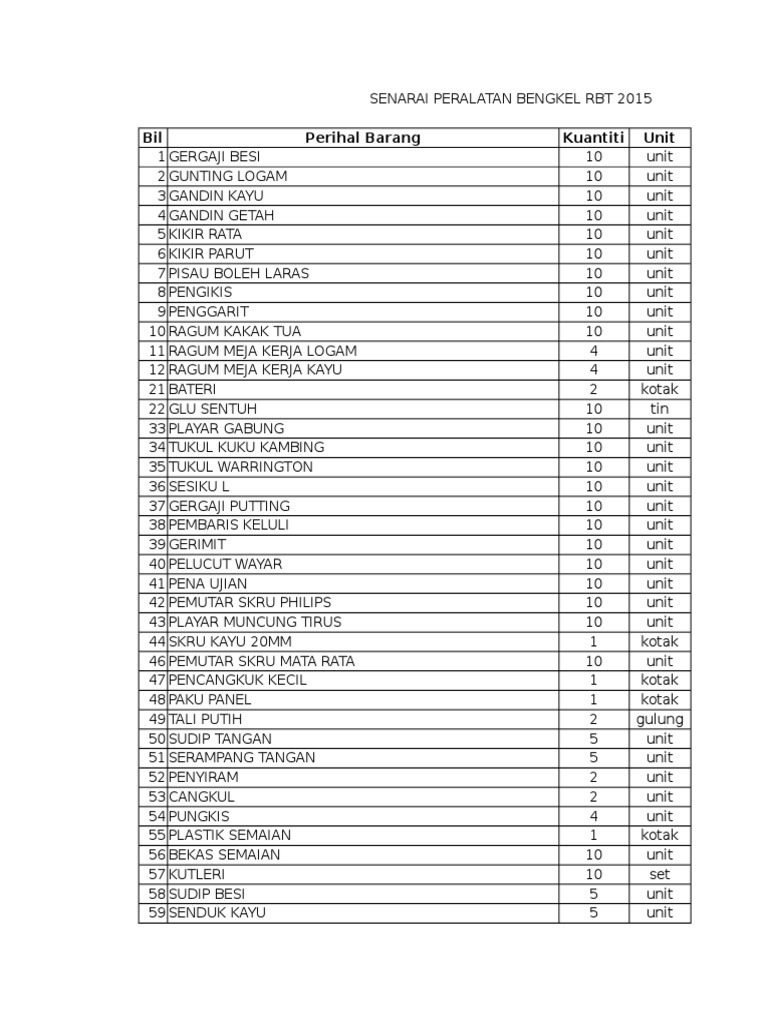 Senarai Peralatan Bengkel Rbt Pdf